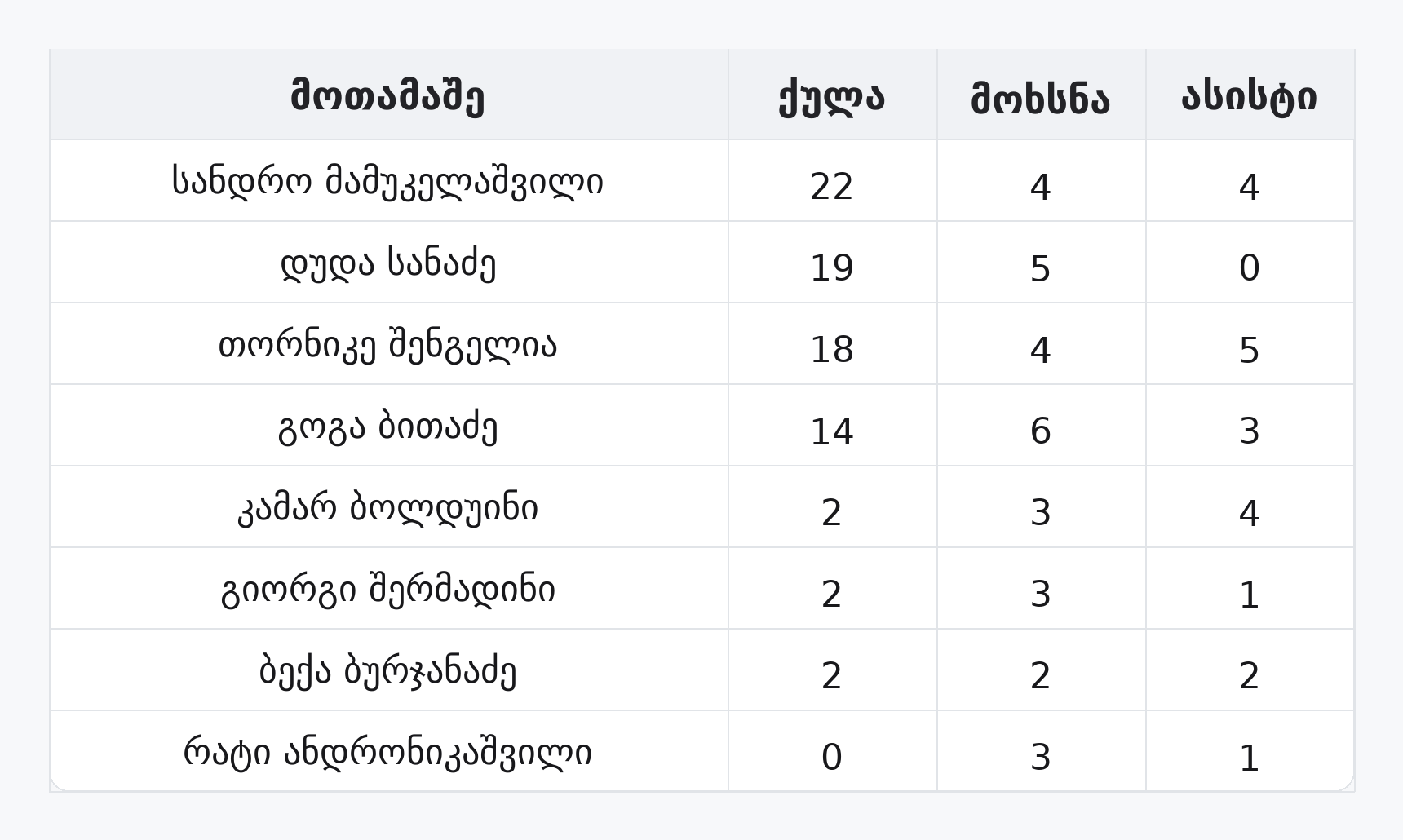 საერთოდ არ დაუსვენია სანდრო მამუკელაშვილს. ბოლდუინმა 1 წუთი დაისვენა, შენგელიამ 3, ბითაძემ 3.5;