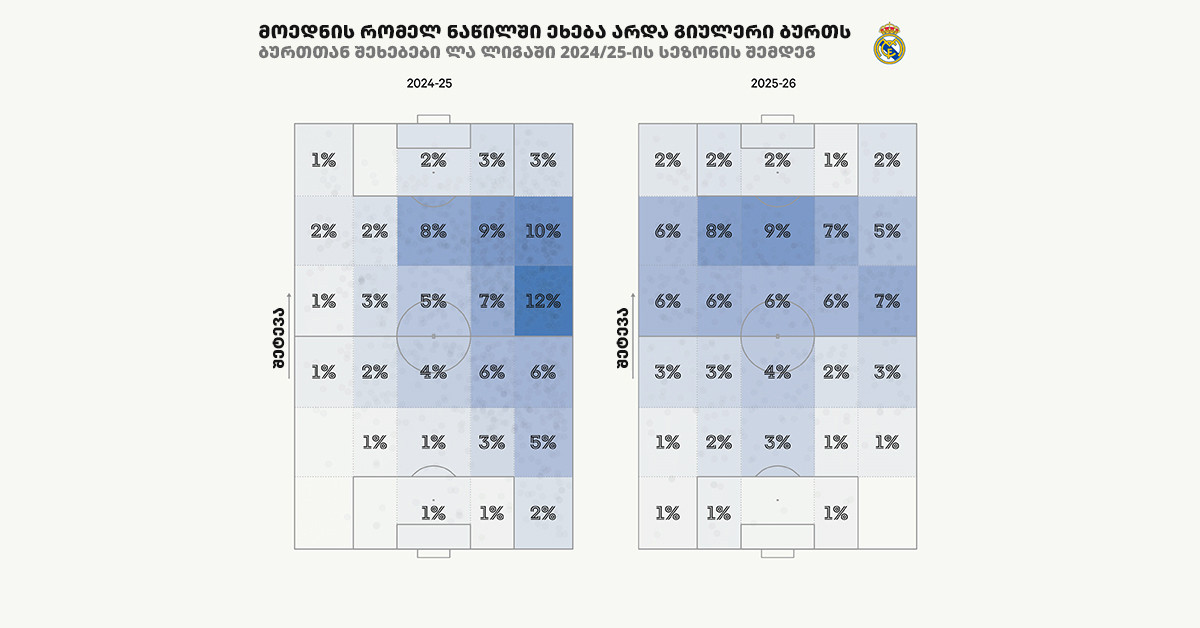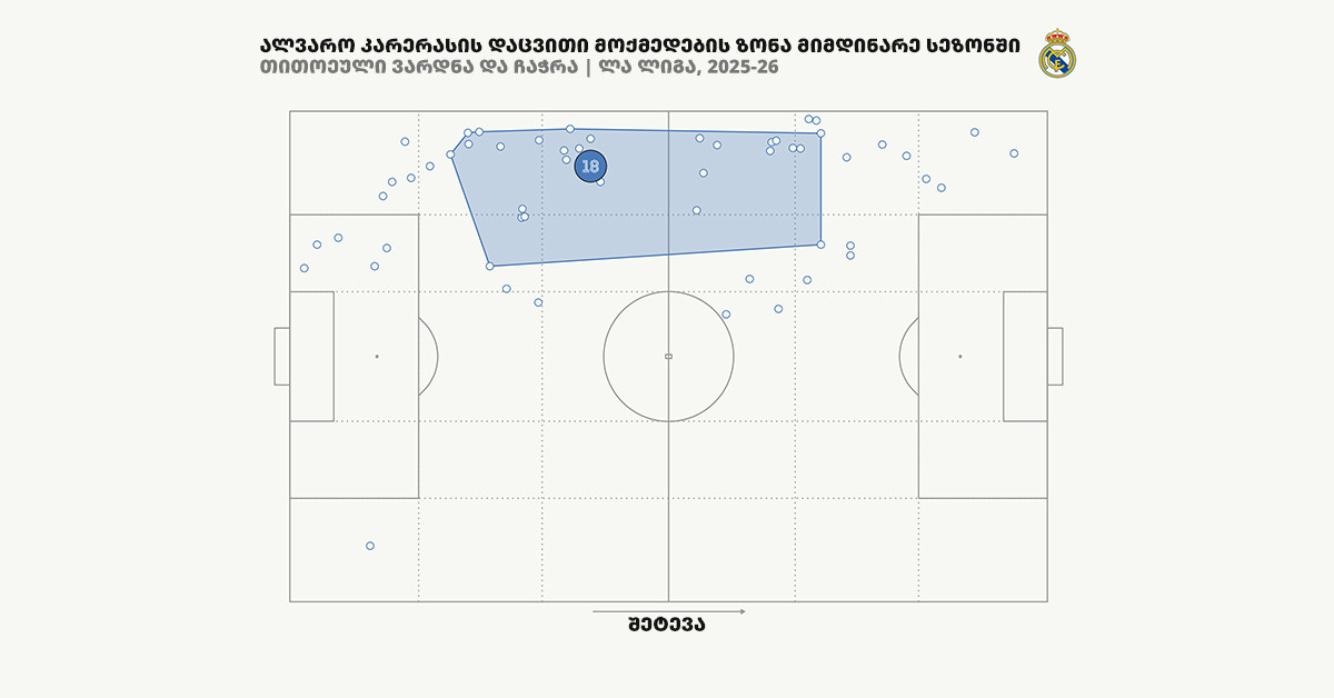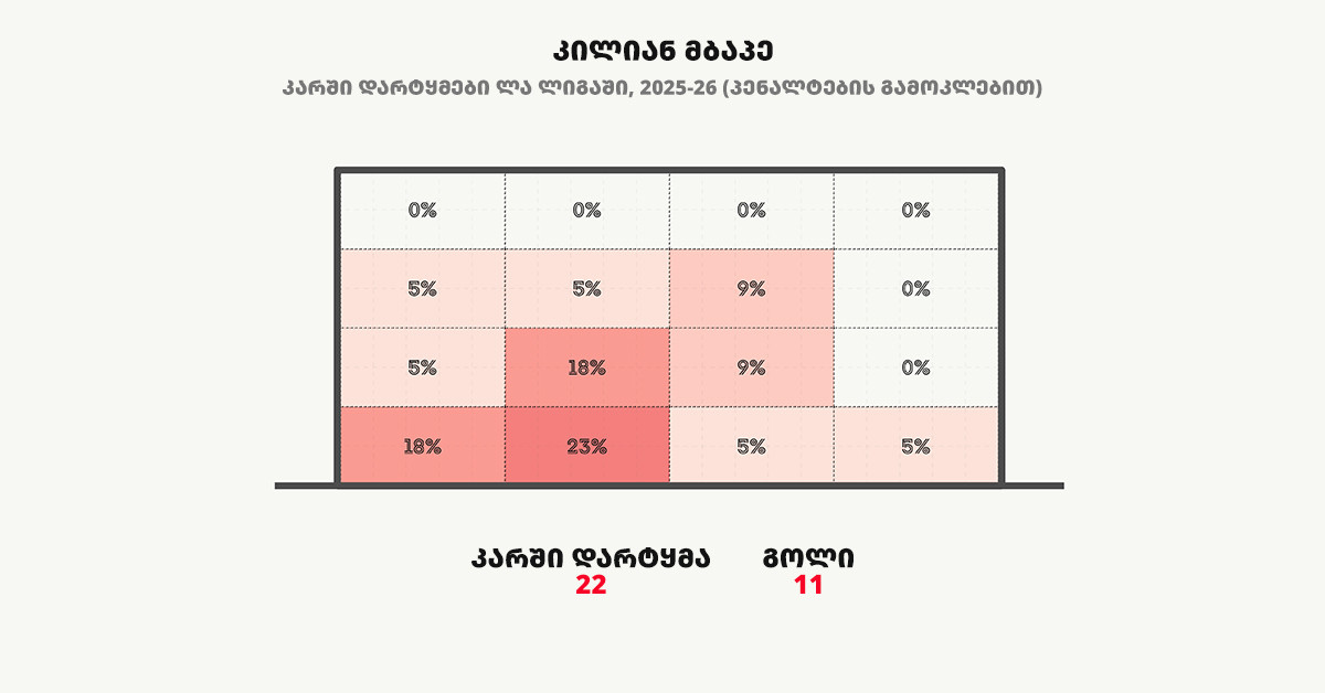 შედეგები ყველაფრის მეტყველია: მიმდინარე სეზონში, კილიანმა უკვე 16 გოლი გაიტანა, რასაც 2 ასისტიც დაუმატა და ამ შედეგით, სტატისტიკურად, "რეალის" გატანილ გოლში ყოველ 63.4 წუთში ერთხელ მონაწილეობს. მისი თითოეული დარტყმის შემდეგ, მოსალოდნელი გოლის კოეფიციენტი 0.16-დან 0.18-მდე გაიზარდა, რაც იმის მანიშნებელია, რომ მბაპე კიდევ უფრო სახიფათო გახდა შემტევ ზონაში. ქვემოთ მოცემულ გამოსახულებაზე ვხედავთ, რომ მბაპე ყველაზე ხშირად მეკარისგან მარჯვენა, დაბალ კუთხეში უმიზნებს - რაც მისი საფირმო ხელწერაა.