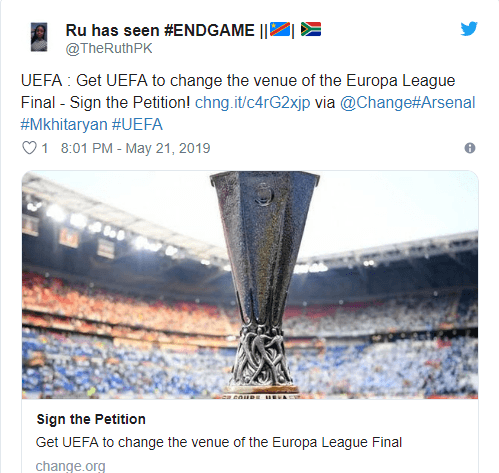 "უნდა გამოუცხადონ თუ არა "არსენალმა" და "ჩელსიმ" ევროპა ლიგის ფინალის ბაქოში ჩატარებას ჰენრიკ მხითარიანის გამო ბოიკოტი? წარმოიდგინეთ ამ საშიშროების წინაშე ედენ აზარი ან რომელიმე ინგლისელი ფეხბურთელი რომ დამდგარიყო და ბაქოში გამგზავრების შესაძლებლობა არ ჰქონოდა." - აღნიშნულია ერთ-ერთ პეტიციაში.