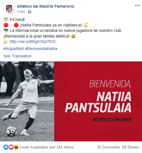 მადრიდის "ატლეტიკომ" ოფიციალურად დაადასტურა ნათია ფანცულაიას ტრანსფერი. ფანცულაიას ტრანსფერთან დაკავშირებით, მადრიდელებმა Facebook-ზე განათავსეს პოსტი.