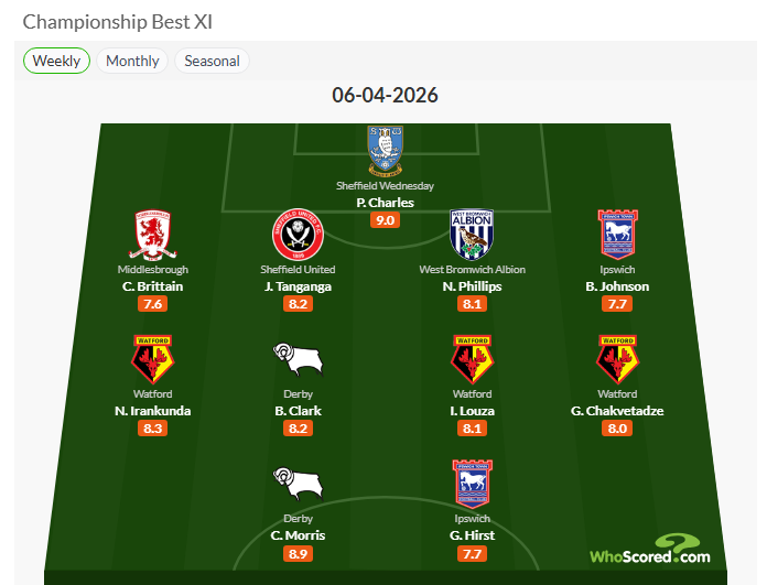 ნახევარმცველები: გიორგი ჩაკვეტაძე (უოტფორდი) - 8.0, იმრან ლოუზა (უოტფორდი) - 8.1, ნესტორ ირანკუნდა (უოტფორდი) - 8.3, ბობი კლარკი (დერბი) - 8.2
