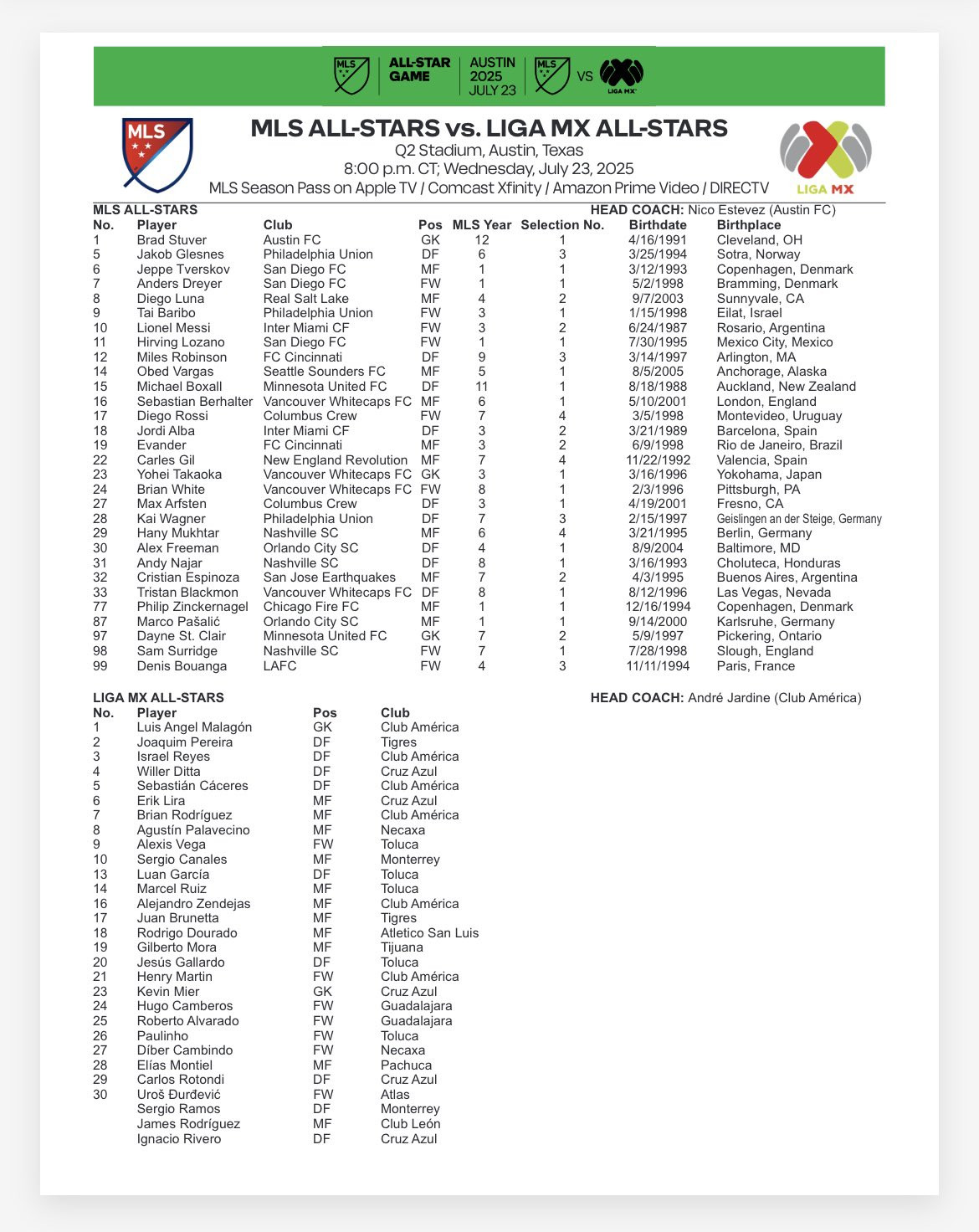 23 ივლისს, ამერიკაში, ყველა ვარსკვლავის მატჩი გაიმართება. მიუხედავად იმისა, რომ MLS-ის ALL STAR-ის თამაში 1996 წლიდან ტარდება, ფორმატი და მოწინააღმდეგეები წლების განმავლობაში მრავალჯერ შეიცვალა. 2021 წლიდან, ლიგა MX (მექსიკის ჩემპიონატი) MLS-ის რეგულარული მეტოქე გახდა, სადაც ორივე ჩემპიონატს საკუთარი საუკეთესოები გამოჰყავს.