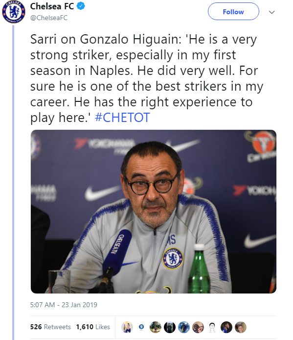 სარის მტკიცებით, იგუაინი უახლოეს საათებში მოაწერს კონტრაქტს ხელს. "არისტოკრატების" თავკაცს სჯერა, რომ იგუაინი მომენტალურად დაიწყებს გოლების გატანას - თუმცა გოლებზე მეტად "ჩელსის" წარმომადგენელთათვის იგუაინის კარგი თამაში უფრო მნიშვნელოვანია. მაურისიო სარი იმედოვნებს, რომ იგუაინს მის საუკეთესო ფორმაში დააბრუნებს.