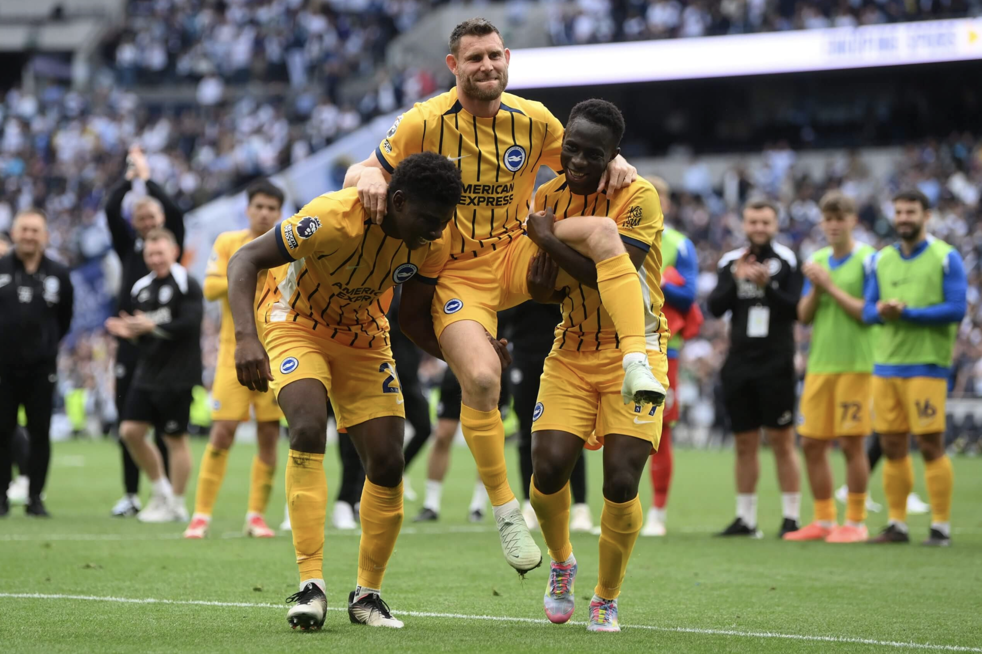კარლოს ბალება და იანკუბა მინტე ხელში აყვანილს ატარებენ ჯეიმს მილნერს, რომელიც 2025 წლის მაისში, „ტოტენჰემის“ წინააღმდეგ მატჩში, ცხრათვიანი იძულებითი პაუზის შემდეგ მოედანზე დაბრუნებას ზეიმობს