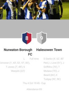 მატჩში, სადაც ერთმანეთს "ნუნეატონ ბოროუ" და "ჰალესოვენ თაუნი" დაუპირისპირდნენ, 17 გოლი გავიდა, თუმცა ამაზე მნიშვნელოვანი ის ფაქტია, რომ მასპინძლები 30-ე წუთზე 7:2 იგებდნენ, თუმცა მატჩი 8:9 დათმეს.