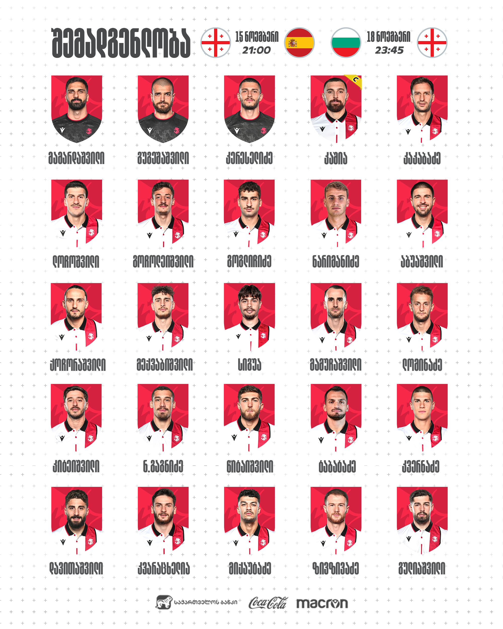 საქართველოს ნაკრების შემადგენლობა ნოემბრის შეხვედრებისთვის