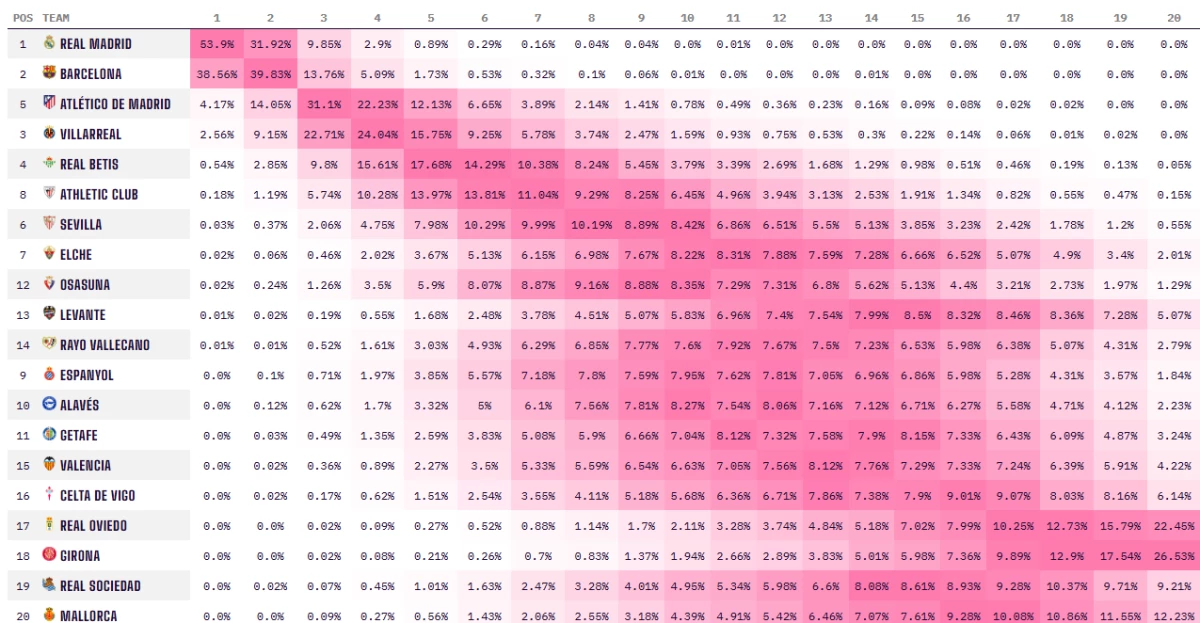 მთავარი ფავორიტი რეალია, რომლის საჩემპიონო ალბათობა 53,9%-ია. მეორე ადგილს ბარსელონა იკავებს (38,56%), მესამეზე ატლეტიკოა (4,17%), მეოთხეზე კი - ვილიარეალი (2,56%).