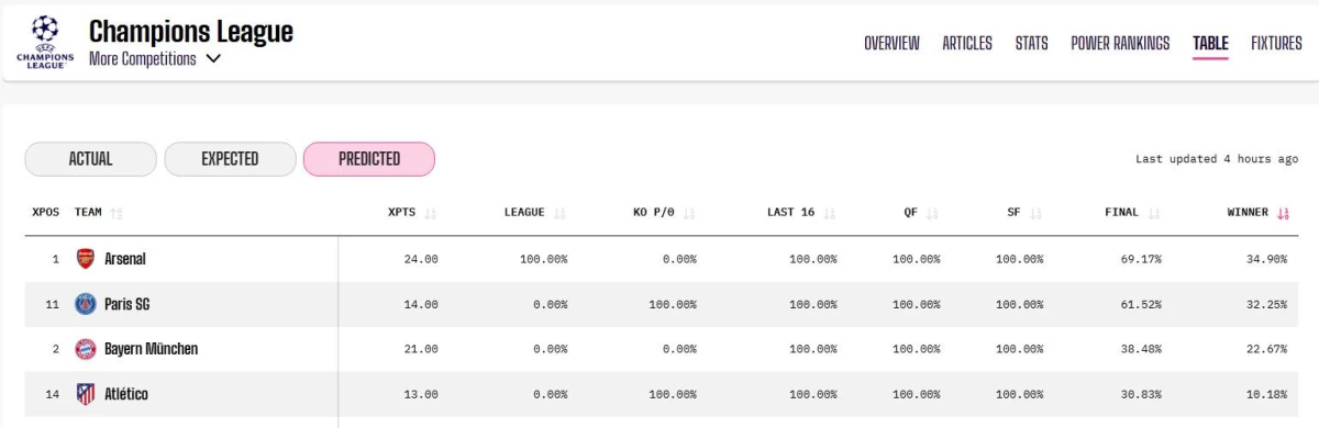 ჩემპიონობის მთავარ ფავორიტად კვლავ არსენალი რჩება (34,9%), მეორე ადგილზე კი პარი სენ ჟერმენმა ბაიერნი ჩაანაცვლა.