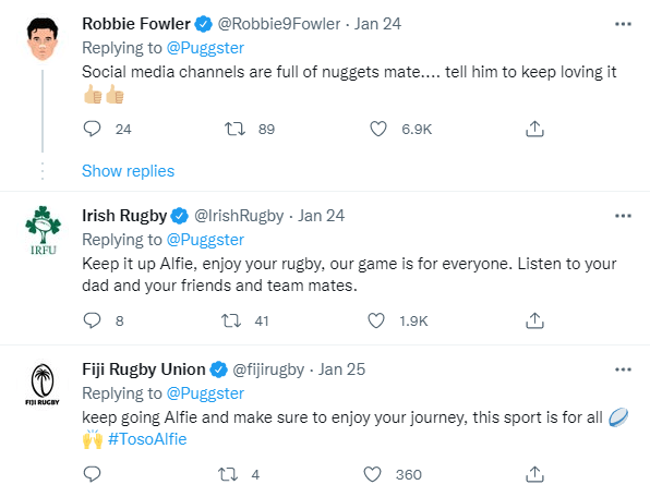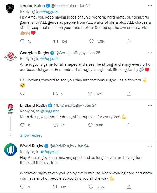Twitter-ზე განთავსებული პოსტის შემდეგ, მსოფლიოს სარაგბო ოჯახი პატარა ალფის მხარდასაჭერად და გასამხნევებლად გაერთიანდა - გამონაკლისი არც საქართველოს რაგბის კავშირი გამხდარა. ნაიჯელ ოუენსი ერთ-ერთი პირველია, რომელიც ალფის გამოეხმაურა. მსოფლიო რაგბის ვეტერანი და გამორჩეული მსაჯის კვალდაკვალ, ვარსკვლავებმა და სხვადასხვა ერის სარაგბო კავშირებმა მხარდასაჭერი პოსტები განათავსეს. მსოფლიო რაგბის დიდმა ოჯახმა კიდევ ერთხელ და ნათლად აჩვენა ის მთავარი ღირებულებები, რომლითაც სპორტის ეს სახეობაა ცნობილი და რომლითაც თაობები იზრდებიან.