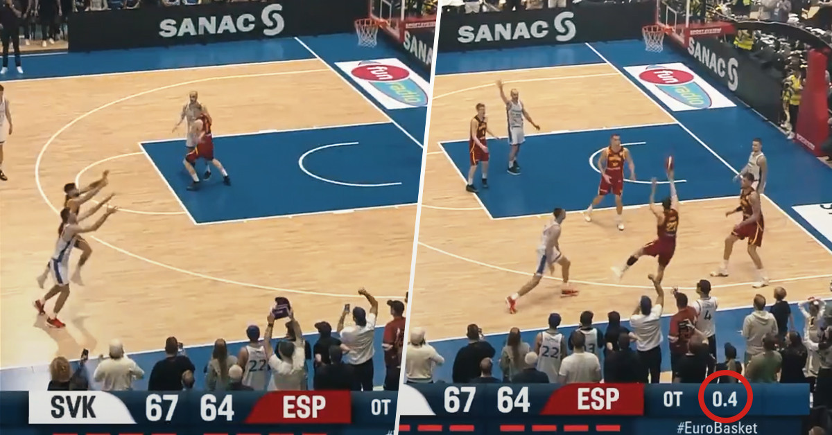შეხვედრაში საოცარი რამ მოხდა, პირველი ოვერტაიმის დასრულებამდე 0.4 წამი იყო დარჩენილი და ანგარიში სლოვაკეთის სასარგებლოდ 67:64 იყო, ბურთი სლოვაკეთს შემოჰქონდა, მაგრამ ესპანელმა კალათბურთელმა სანტიაგო იუსტამ ჩაჭრა და სამქულიანიც ზუსტად შეასრულა, საბოლოოდ მეორე ოვერტაიმში გადასული თამაშის მოგება ესპანეთმა შეძლო.