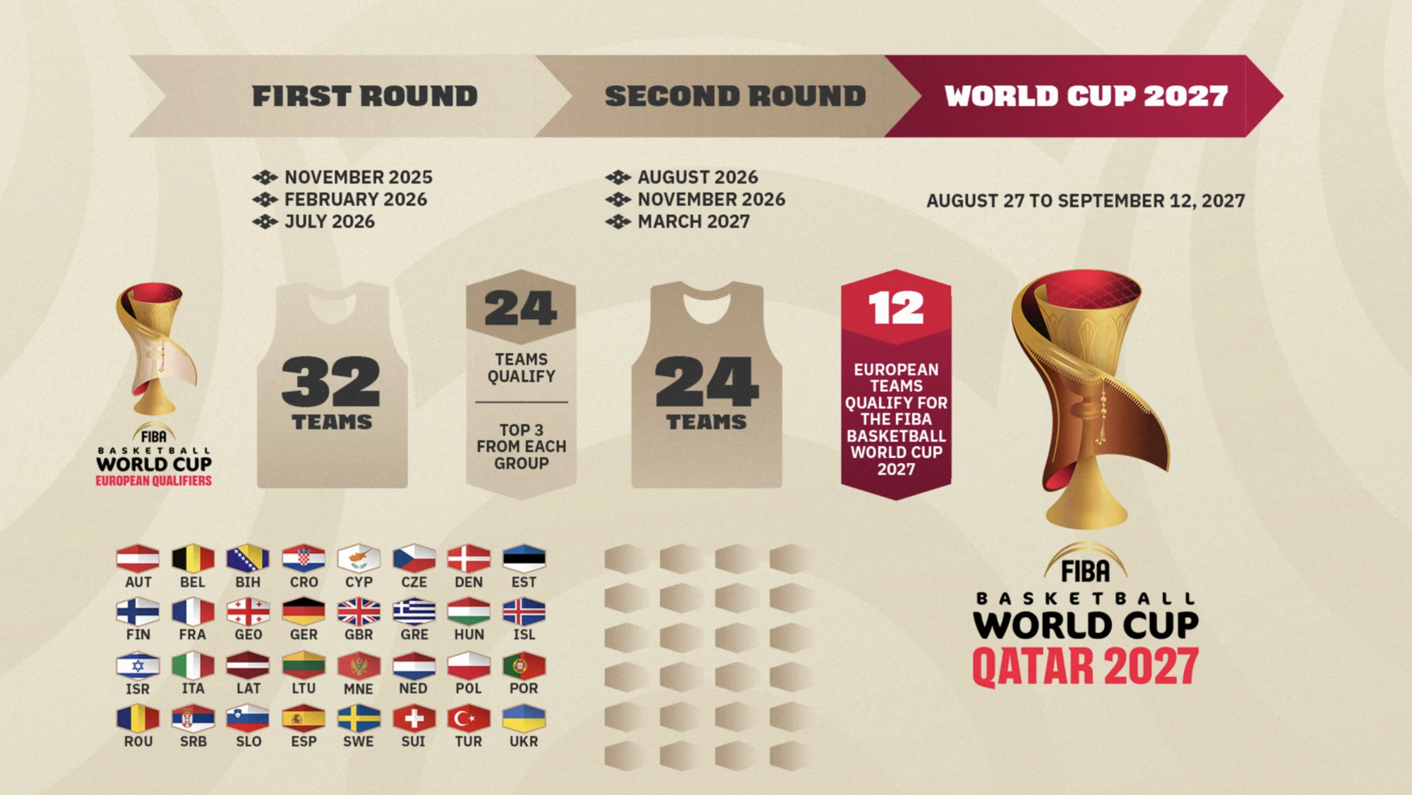 დავიწყოთ თავიდან: პირველად ისტორიაში, 2027 წლის მსოფლიო ჩემპიონატი არაბული სამყაროს წარმომადგენელ ქვეყანაში - კატარში ტარდება. ტურნირზე მონაწილეობას 32 ნაკრები მიიღებს, ევროპისთვის კი 12 ადგილია გამოყოფილი.