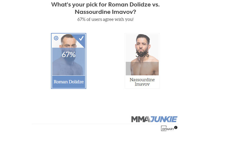 ცნობილმა გამოცემამ MMA Junkie-მ გულშემატკივრებს შორის გამოკითხვა ჩაატარა, რომელიც მომავალ ღონისძიებას ეხება. გულშემატკივრებს სხვადასხვა ბრძოლებში საკუთარი ფავორიტების დაფიქსირება სთხოვეს. UFC Vegas 85-ზე რომან დოლიძე საღამოს მთავარ ბრძოლას ჩაატარებს. მისი მეტოქე საშუალო წონის მე-11 ნომერი ნასურდინ იმავოვი იქნება. გამოკითხულთა 67%-მა ამ დაპირისპირებაში ფავორიტად რომან დოლიძე დაასახელა.