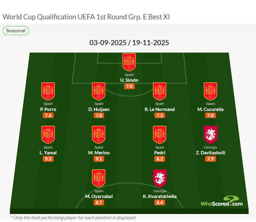Whoscored-ის მიერ გამოქვეყნებული მონაცემების მიხედვით სექტემბრის თვის საუკეთესო თერთმეტეულში ორი ქართველი და ცხრა ესპანელი ფეხბურთელი მოხვდა.