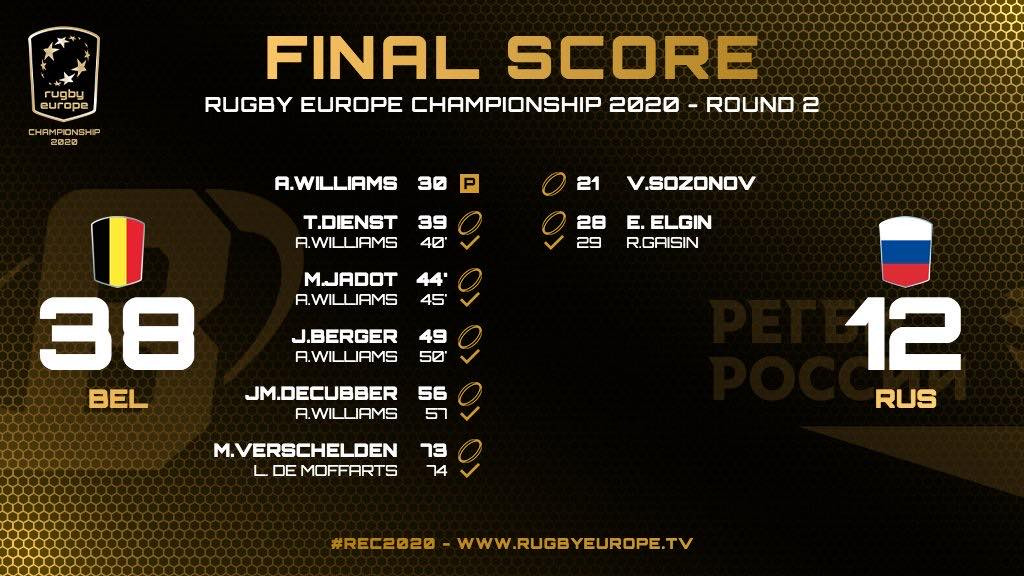 მეორე ტაიმში, დაცვაში კატასტროფული თამაშის პარალელურად, რუსეთი მორაგბეთა ეროვნულმა ნაკრებმა ვერც შეტევაში შეძლო ქულის აღება და საბოლოოდ დაპირისპირება ბელგიის დომინანტური გამარჯვებით (38:12) დასრულდა.