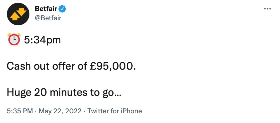 აღსანიშნავია, რომ პირველი ტაიმის დასრულების შემდეგ, იმ დროს, როდესაც "მანჩესტერ სიტი" 0:1 მარცხდებოდა, Betfair-მა მომხმარებელს ქეშ-აუთის სახით £62,371 შესთავაზა, თუმცა ტანიამ თანხის განაღდებაზე უარი განაცხადა. 75-ე წუთზე, "მანჩესტერ სიტი" 0:2 მარცხდებოდა, ქეშ-აუთის სახით Betfair-მა მომხმარებელს £95,000 შესთავაზა, თუმცა "სიტის" მარცხსა და "ლივერპულის" ჩემპიონობაში დარწმუნებულმა ტანიამ კვლავ უარი განაცხადა და ქეშ-აუთი არ გამოიყენა.