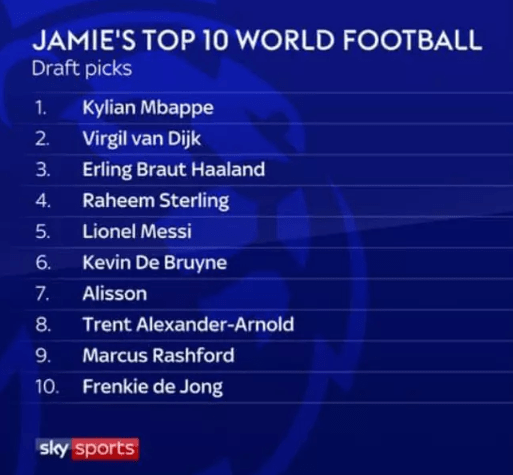 რაც შეეხება კარაგერს, მის ათეულშიც პირველ ადგილზე მბაპე გახლავთ, მაგრამ განსხვავებით ნევილისგან, ჯეიმიმ, მესი საუკეთესოებში შეიყვანა.