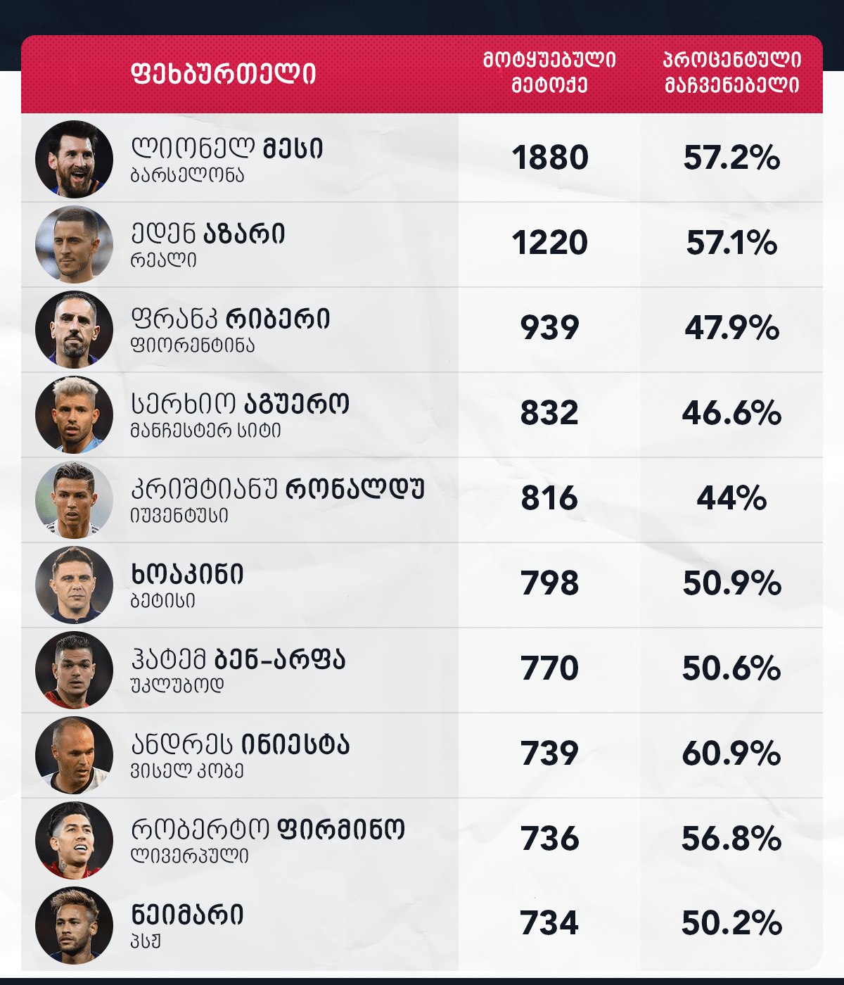 აღსანიშნავია, რომ ყველაზე მაღალი პროცენტული მაჩვენებელი ანდრეს ინიესტას აქვს, ხოლო ყველაზე დაბალი - კრიშტიანუ რონალდუს.