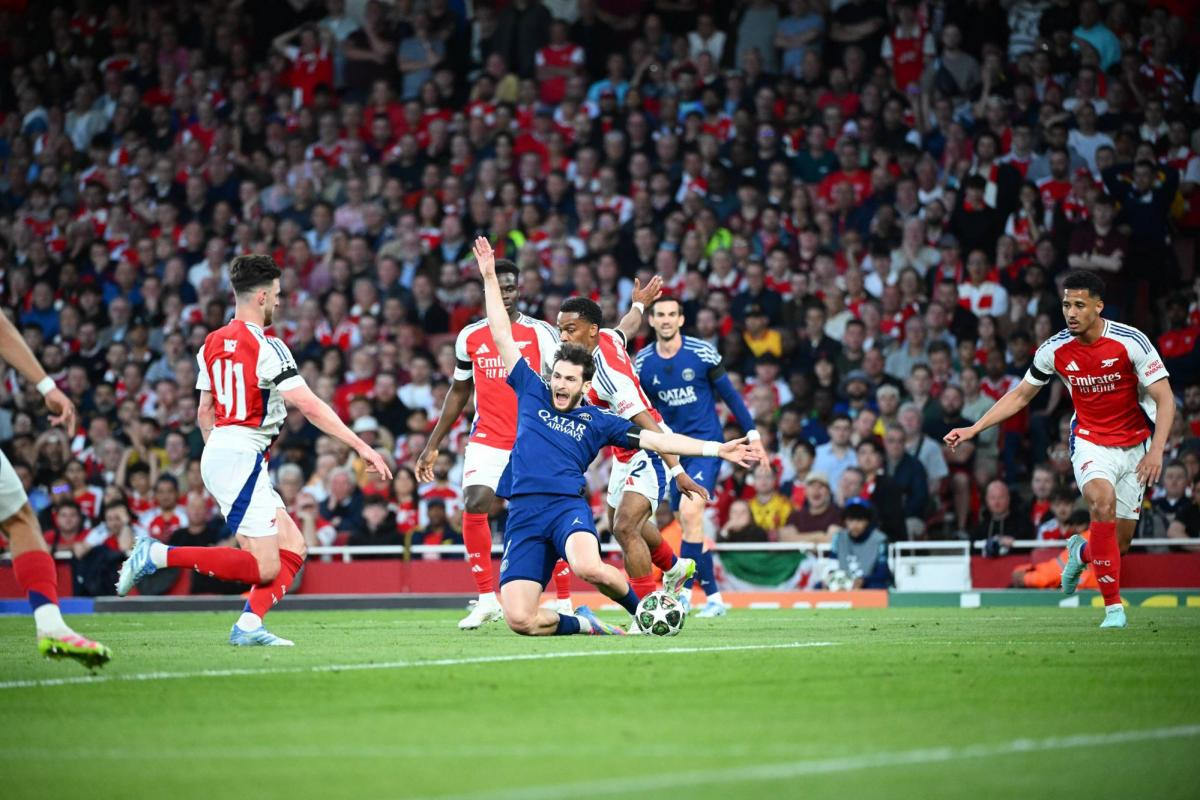 ,,არსენალისა'' და ,,პსჟ-ს'' შეხვედრის მე-16 წუთზე ლონდონური გუნდის მცველმა კვარა საჯარიმოში წააქცია, თუმცა არბიტრმა, სლავკო ვინჩიჩმა, თამაშის წესების დარღვევა არ დააფიქსირა: