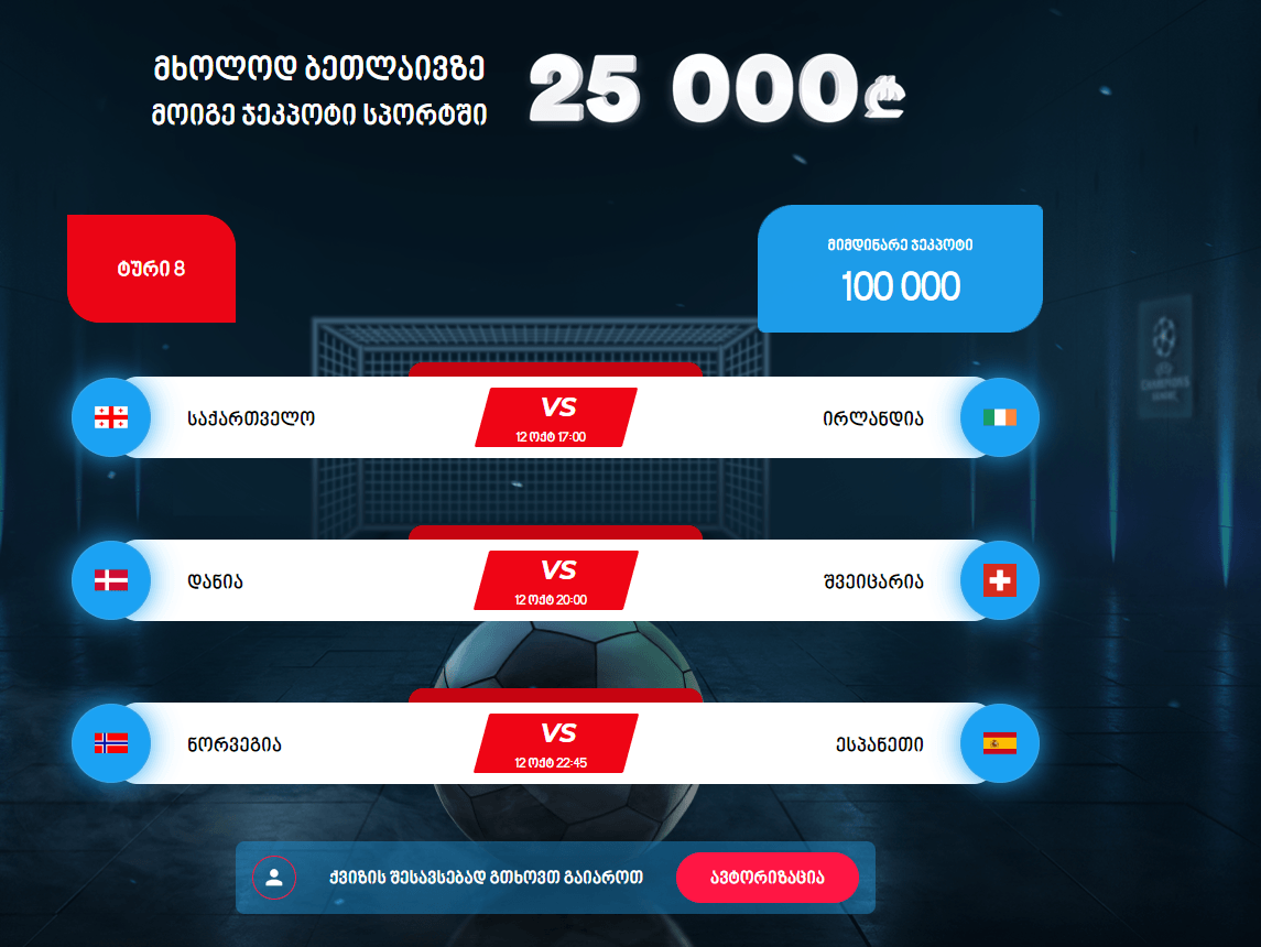 - ჯეკპოტის საპრიზო ფონდის პარალელურად ყოველ ტურში დამატებით გათამაშდება 25,000₾ Freebet Jackpot.