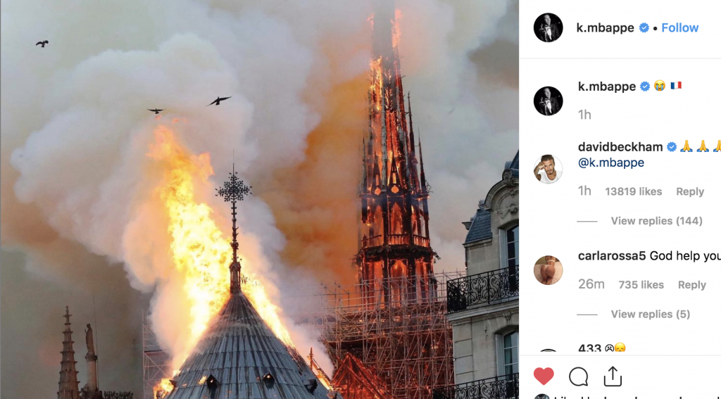 Images terribles de la Cathédrale Notre-Dame de Paris, l’un des plus beaux monuments de notre ville, en proie aux flammes. Courage à toutes les personnes mobilisées pour éteindre cet incendie.— Paris Saint-Germain (@PSG_inside) April 15, 2019
