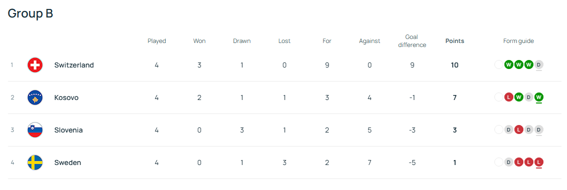 შვედეთის ეროვნული ნაკრები მსოფლიო ჩემპიონატის საკვალიფიკაციო ეტაპის B ჯგუფში ასპარეზობს და 1 ქულით ბოლო, მე-4 ადგილზეა.