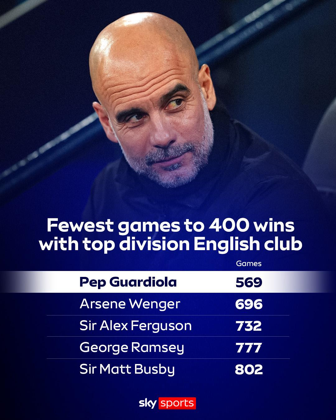 პეპ გვარდიოლამ მორიგი გენიალური მიღწევა დააფიქსირა. ესპანელი სპეციალისტის გაწვრთნილმა მანჩესტერ სიტიმ, გუშინ, ჩემპიონთა ლიგის ბოლო ტურში გალათასარაი 2:0 დაამარცხა, ამით ყველა ტურნირის ეგიდით, გვარდიოლამ ინგლისის უმაღლესი ლიგის მწვრთნელებიდან ყველაზე სწრაფად დააგროვა 400 გამარჯვება, მას ამისთვის მხოლოდ 569 შეხვედრა დასჭირდა.