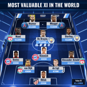 გთავაზობთ ყველაზე ძვირადღირებული ფეხბურთელების სასტარტო თერთმეტეულს :მეკარე - იან ობლაკი (მადრიდის ატლეტიკო) 90 მილიონი ევრომარცხენა მცველი - ალფონსო დევისი (მიუნხენის ბაიერნი) 80 მილიონი ევროცენტრალური მცველი - ვირჯილ ვან დეიკი (ლივერპული) 80 მილიონი ევროცენტრალური მცველი - მატეის დე ლიხტი (იუვენტუსი) 70 მილიონი ევრომარჯვენა მცველი - ტრენტ ალექსანდერ-არნოლდი (ლივერპული) 110 მილიონი ევროცენტრალური ნახევარმცველი - ჯოშუა კიმიხი (მიუნხენის ბაიერნი) 85 მილიონი ევრომარცხენა შემტევი - სადიო მანე (ლივერპული) 120 მილიონი ევროგამთამაშებელი - კევინ დე ბრუინი (მანჩესტერ სიტი) 120 მილიონი ევრო მარჯვენა შემტევი - რაჰიმ სტერლინგი (მანჩესტერ სიტი) 128 მილიონი ევრო ცენტრალური თავდამსხმელი - კილიან მბაპე (პსჟ) 180 მილიონი ევროცენტრალური თავდამსხმელი - ნეიმარი (პსჟ) 128 მილიონი ევრო