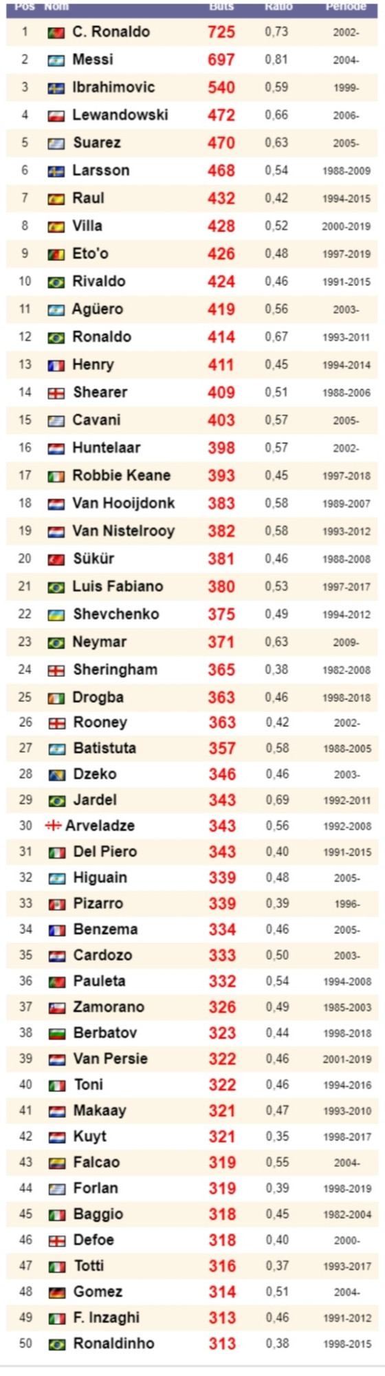 ლიდერობას კრიშტიანუ რონალდუ არავის უთმობს, ვინც 21-ე საუკუნეში 725 ბურთი შეაგდო. პორტუგალიელთან ყველაზე ახლოს კი მისი მარადიული მეტოქე ლიონელ მესია, რომლის ანგარიშზეც 697 გოლია.