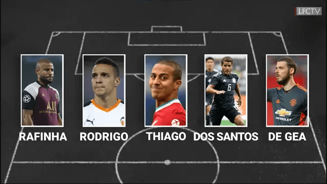 საინტერესოა, რომ წარმოშობით ბრაზილიელმა ფეხბურთელმა საუკეთესო ხუთეულში საკუთარი თავი და თავისი ძმა, რაფინიაალკანტარა შეიყვანა, რომელიც ამჟამად "პსჟ-ს" მაისურს ირგებს. მეკარის პოზიციაზე მერსისაიდული კლუბის ახალწვეულმა თანამემამულე, "მანჩესტერ იუნაიტედის" გოლკიპერი დავიდ დე ხეა აირჩია. სიაში "ლა მასიას" აღზრდილი კიდევ ერთი ფეხბურთელი ჯონათან დოს სანტოს მოხვდა, რომელიც 2017 წლიდან "ლოს ანჯელეს გალაქსიში" ირიცხება. ხუთეულში ძმები ალკანტარების მსგავსად კიდევ ერთი ესპანელ-ბრაზილიელია, საუბარი როდრიგო მორენოზეა, რომელმაც 2020 წლის ზაფხულში "ვალენსიადან" "ლიდს იუნაიტედს" მიაშურა.
