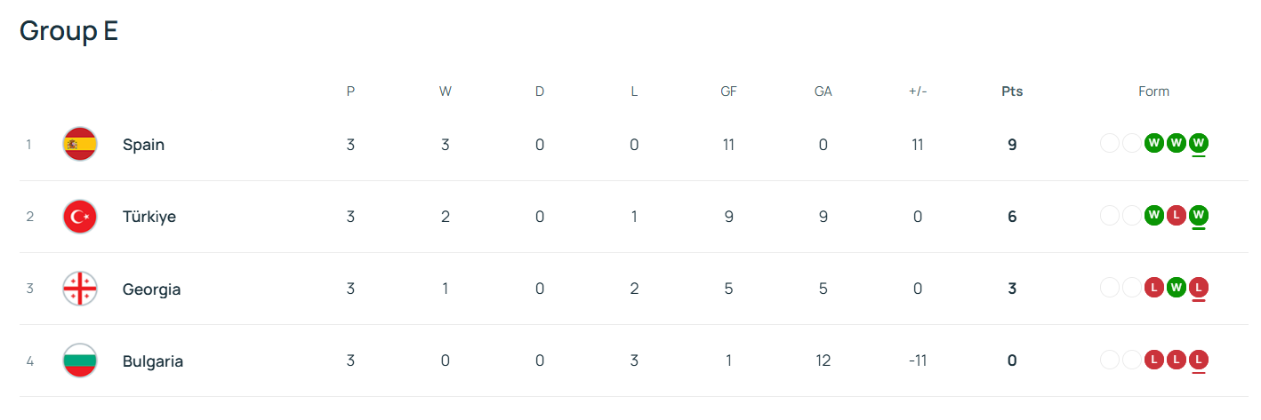 შეგახენებთ, რომ საქართველოს ეროვნული ნაკრები E ჯგუფში ასპარეზობს, სადაც 3 ქულა აქვს და მე-3 პოზიციას იკავებს.