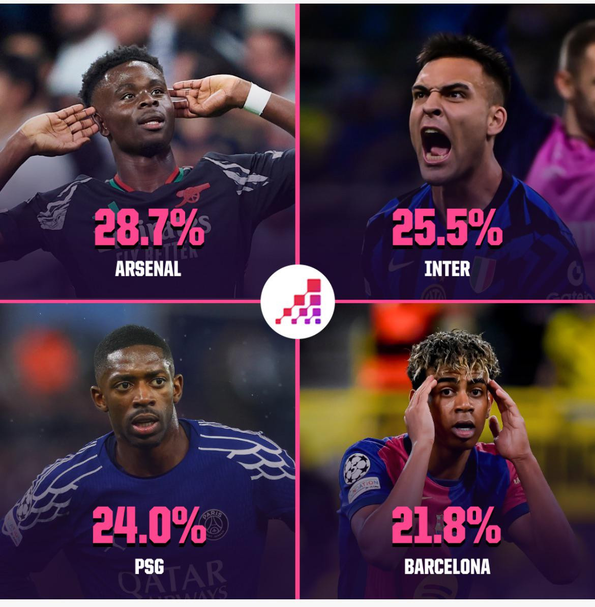 Opta-ს კომპიუტერული მოდელის პროგნოზით, ,,არსენალს'' ჩემპიონთა ლიგის მოგების ყველაზე მაღალი - 28.7%-იანი შანსი აქვს. მეორე ადგილზე 25.5%-ით "ინტერია", მესამე პოზიციაზე 24%-ით "პსჟ", ხოლო ყველაზე ნაკლებ შანსს "ბარსელონას" აძლევენ.