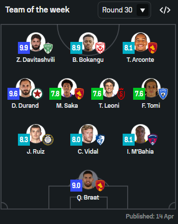 თავდამსხმელები: ბრენდონ ბოკანგუ (ნანსი) - 8.9, ტაირიქ არკონტე (როდეზი) - 8.1, ზურიკო დავითაშვილი (სენტ-ეტიენი) - 9.9