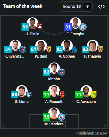 ნახევარმცველები: ვიტინია (პსჟ) - 8.3, ხვიჩა კვარაცხელია (პსჟ) - 8.4, უესლი საიდი (ლანსი) - 8.7, ანხელ გომესი (მარსელი) - 8.1, ფლორიან ტოვინი (ლანსი) - 8.3
