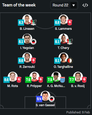 მცველები: მატს როტსი (ტვენტე) - 8.6, რობინ პროპერი (ტვენტე) - 7.6, ანსელმო გარსია მაკნოლტი (ზვოლე) - 7.5, ბარტ ვან როაი (ტვენტე) - 7.7