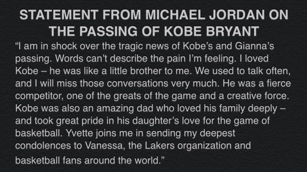 კალათბურთის ღმერთად წოდებული, ლეგენდარული N23 - მაიკლ ჯორდანი, კობი ბრაიანტის გარდაცვალებას ეხმაურება.