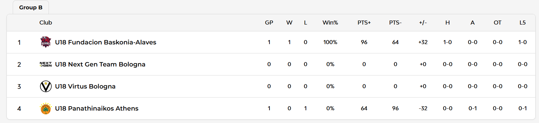 ახალგაზრდული ევროლიგის ჯგუფურ ეტაპზე ბასკონიას 18-წლამდელებმა პანათინაიკოსის ასაკობრივი გუნდი დიდი სხვაობით 96:64 დაამაცხეს.
