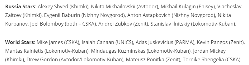 ლიგის ALL STAR-ი 14 თებერვალს, მოსკოვში გაიმართება, სადაც მონაწილეობას ჩემპიონატის საუკეთესო მოთამაშეები მიიღებენ. ყველა ვარსკვლავის მატჩი შემდეგნაირად ჩატარდება და ერთმანეთს შემდეგი პრინციპით დაუპირისპირდებიან: VTB ლიგისსაუკეთესო რუსი კალათბურთელები Vs. ლეგიონერები.