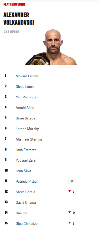 დღეს UFC-ს რეიტინგი განახლდა და დივიზიონებში გარკვეული ცვლილებებია. აბუ დაბიში ჩატარებული ღონისძიების შემდეგ, რეიტინგში განსაკუთრებული არაფერი შეცვლილა. მიუხედავად ამისა, ცვლილებები ქართველ მებრძოლსაც შეეხო. გიგა ჭიკაძე ქვემსუბუქი წონის დივიზიონში ერთი საფეხურით დაქვეითდა. საბედნიეროდ გიგა თხუთმეტეულში ადგილს ინარჩუნებს და ბოლო მე-15 პოზიციაზეა.