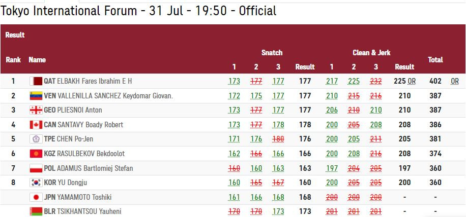 ოლიმპიური ჩემპიონი ყატარელი ფარეს იბრაჰიმ ელბახი გახდა, რომელმაც 402 კილოთი ოლიმპიური რეკორდიც დაამყარა.