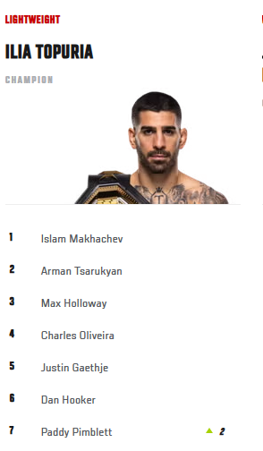 UFC-ს რეიტინგების განახლების შემდეგ, მსუბუქ დიზივიონში ცვლილებებია. 70 კილოგრამის ზედა ნაწილში მებრძოლები ადგილებს ინარჩუნებენ. ჩვენთვის ყველაზე საინტერესო და თვალში საცემი პადი პიმბლეტის წინსვლაა. ინგლისელმა მებრძოლმა მე-7 პოზიციაზე გადაინაცვლა და საჩემპიონო მარათონს უფრო მიუახლოვდა.
