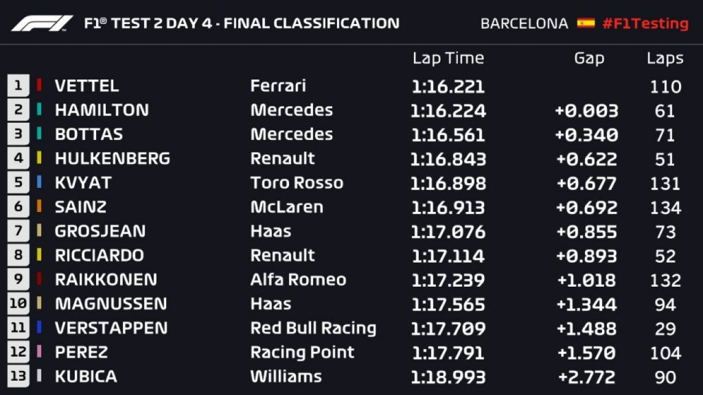 ფერარიმ ტესტირების ბოლო დღეს, წრის საუკეთესო შედეგი დააფიქსირა - 1:16.221, მას მერსედესი 0.03 წამით ჩამორჩა, საბოლოო შედეგი კი იხილეთ ფოტოზე.