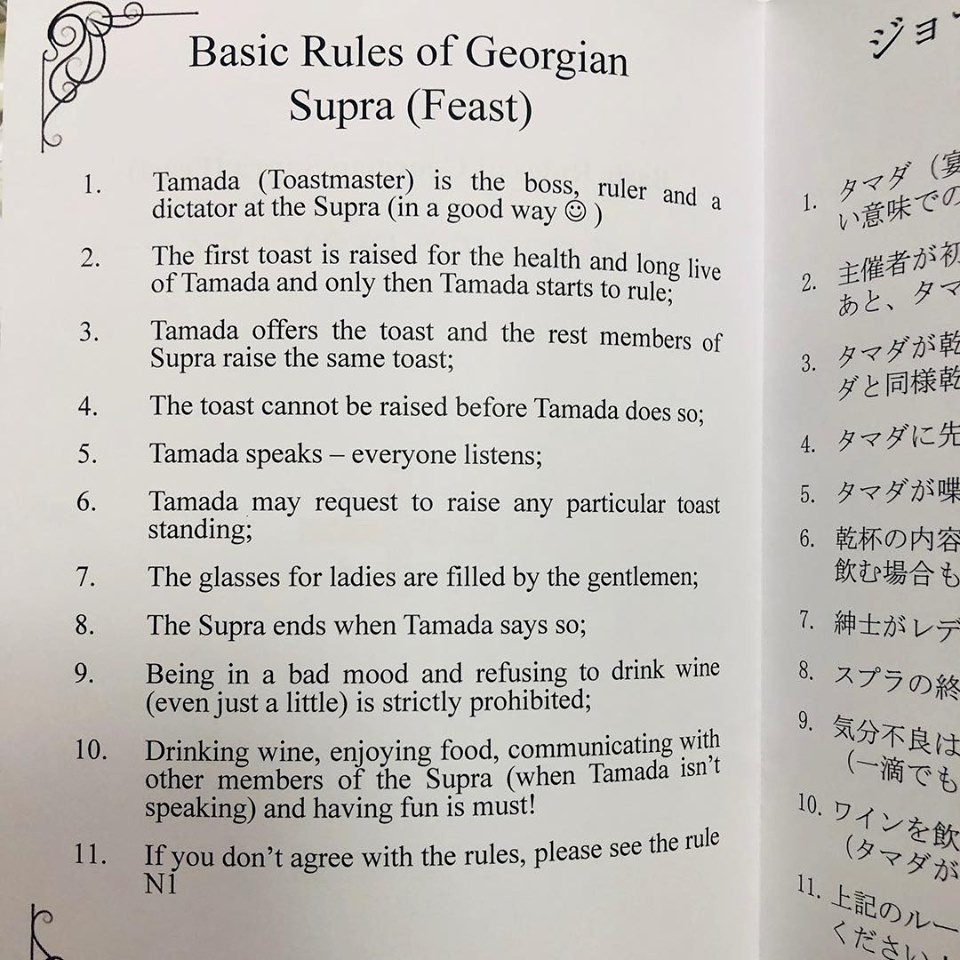 დამსწრე საზოგადოებას ასევე ქართული სუფრის წესები გადაეცა, სადაც შემდეგი პუნქტები იყო გაწერილი: