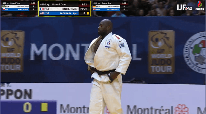 ძალიან დიდ ხნიანი პაუზის შემდეგ ტატამს უძლეველი ფრანგი ოლიმპიური, მსოფლიო და ევროპის ჩემპიონი - ტედი რინერი დაუბრუნდა. ტედიმ წარმოშობით ამერიკელი - აიაქს ტადეჰარა წუთსა და 8 წამში იპონით დაამარცხა და მონრეალის გრან პრის 1/4 ფინალში გავიდა.