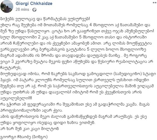 საქართველოს ნაკრების ყოფილმა წევრმა, გიორგი ჩხაიძემ სოციალურ ქსელში მწვავე პოსტი გამოაქვეყნა, სადაც რაგბის კავშირი და მილტონ ჰეიგი გააკრიტიკა.